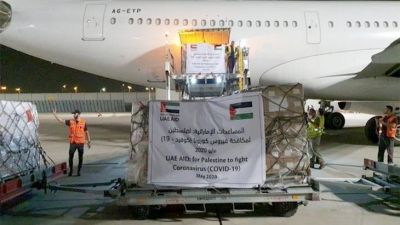 وحطت الرحلة رقم 9607 في المطار وعلى متنها 14 طنا مما قالت الإمارات إنها مساعدات طبية للشعب الفلسطيني من أجل مكافحة فيروس كورونا.