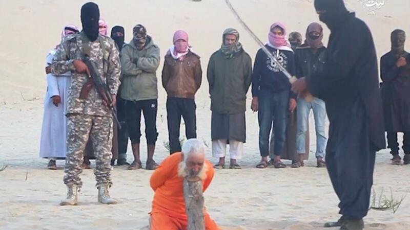 وفي التسجيل خرج رجلان مسنان يرتديان زيا برتقاليا من عربة "فان" سوداء واقتيدا إلى منطقة صحراوية، حيث أعدما بقطع الرأس. وتلا رجل ما قال إنه حكم من محكمة شرعية أدان الرجلين "بالقتل ردة لممارستهما الكهانة وادعاء علم الغيب ودعوة الناس للشرك".