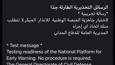 وحثت المديرية العامة للدفاع المدني، المواطنين والمقيمين في تلك المناطق، على المشاركة في تقييم التجربة عبر الرابط الذي سيصل إلى هواتفهم برسالة نصية (SMS)، منوهة بأهمية تحديث أنظمة التشغيل الخاصة بالهواتف المتنقلة إلى آخر إصدار، لضمان استقبال الرسائل والتنبيهات، مؤكدة أنه ليس هناك ما يدعو إلى الذعر أو القلق.