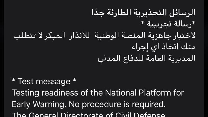 وأرسلت المديرية في تمام الساعة الثانية من بعد ظهر اليوم (بالتوقيت المحلي لمنطقة الرياض)، رسائل الاختبارات التجريبية التي تنفذها المديرية العامة للدفاع المدني على المنصة الوطنية للإنذار المبكر في حالات الطوارئ، وجاء ذلك بعد أن دعت المديرية في وقت سابق إلى عدم القلق مشيرة إلى أن الرسائل لتجربة المنصة ولا تتطلب اتخاذ أي إجراء.