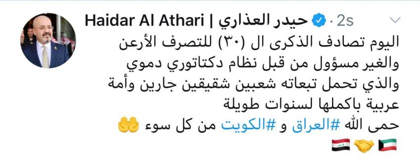 استذكر السفير العراقي في الأردن حيدر العذاري اجتياح العراق للكويت عام 1990، واصفه بالتصرف الارعن وغير المسؤول من قبل نظام دكتاتوري دموي.