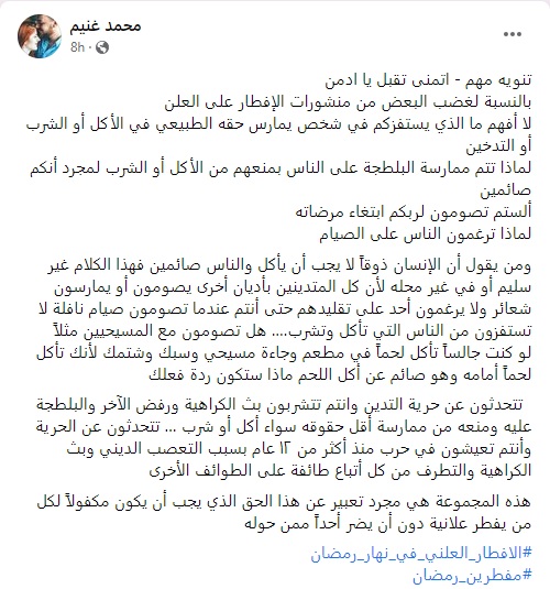 وكانت صفحة مجموعة "مفطرين رمضان" التي تحظى بنحو 7500 متابع قد ظهرت منذ بدايات شهر رمضان، ويعلن اعضاؤها عن انفسهم باعتبارهم اشخاصا يمارسون "حقا طبيعيا" في "الاكل والشرب كأي كآئن بشري آخر قرر ان لا يموت من الجوع".