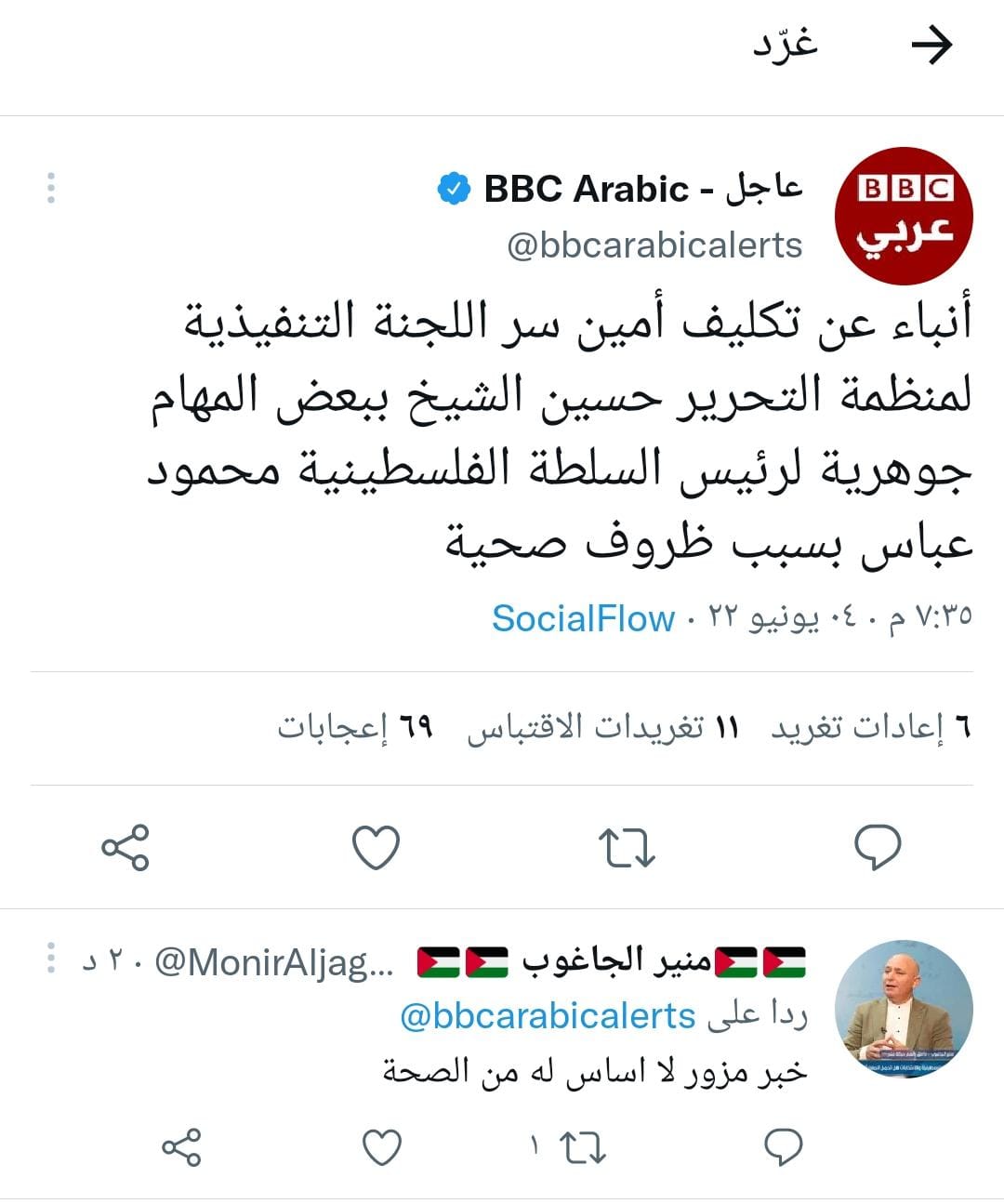 من جهته قال حسين الشيخ في تغريده له على تويتر لا صحة للاخبار الصفراء المتداوله حول صحة السيد الرئيس محمود عباس ، وهو يتمتع بصحة جيده ويزاول عمله كالمعتاد ،وما يروج له الهدف منه العبث بالوضع الداخلي الفلسطيني.
