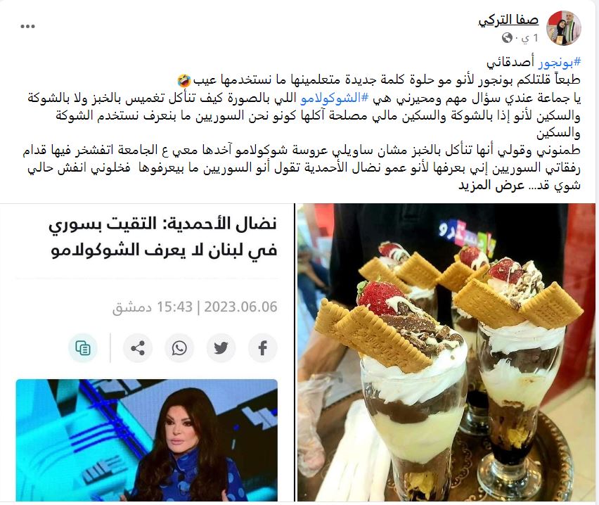التفاصيل كما سردتها الاعلامية اللبنانية انها طلبت من البائع السوري “الشوكولا مو”، ولكنه لم يعرف ما طلبت بالضبط وسردت الحوار الذي دار بينهما :