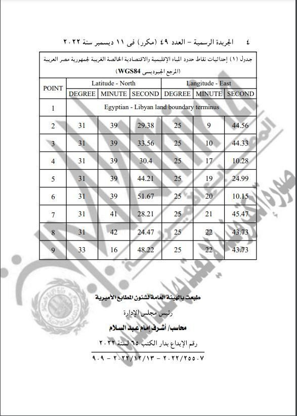 ونصت المادة الاولى من القرار تحديد حدود البحر الإقليمي لمصر وذلك من نقطة الحدود البرية المصرية الليبية النقطة رقم (1) ولمسافة (12) ميلا بحريا وصولا إلى النقطة رقم (8).