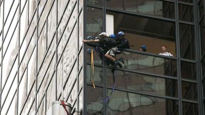 وعندما تسلق الرجل الذي كان يحمل حقيبة فوق ظهره الواجهة الزجاجية للمبنى قامت الشرطة بإزالة الألواح الكبيرة للنوافذ التي فوقه مباشرة فيما وقف عدد من الضباط عند النوافذ وكان بعضهم يضع خوذات على الرأس.