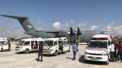 وبعد مرور نحو 48 ساعة على التفجيرين الهائلين اللذين وقعا في مقديشو يوم السبت هبطت طائرة إسعاف تركية في العاصمة وحملت عشرات المصابين الصوماليين لنقلهم إلى تركيا لتلقي العلاج بالمجان.