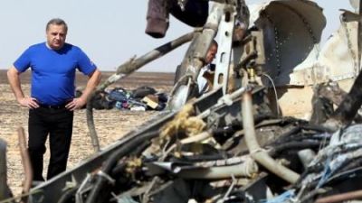 وزير الطوارئ الروسي يقف بين حطام الطائرة المنكوبة في سيناء