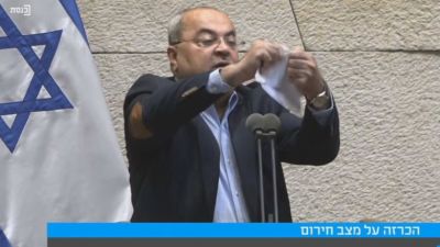 وقام الطيبي بتمزيق صفقة ترامب، والدوس عليها من على منصة الكنيست قائلا: “مصير هذه الصفقة هو تحت الاقدام . نعم تحت الاقدام “.