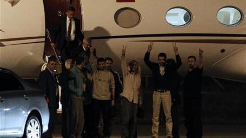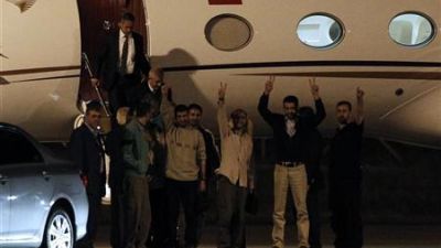 و أظهرت لقطات تلفزيونية 11 فلسطينيا بينهم امرأة وهم يشيرون بعلامة النصر حينما وصلوا إلى تركيا في ساعة مبكرة يوم الاربعاء وذلك في اطار صفقة لتبادل الاسري مع اسرائيل.