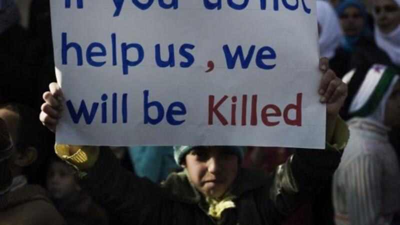 طفل سوري يحمل لافتة في مظاهرة ببلدة القصير،جنوب شرق حمص، كتب عليها :إن لم تساعدوننا فسوف نقتل/أ.ف.ب