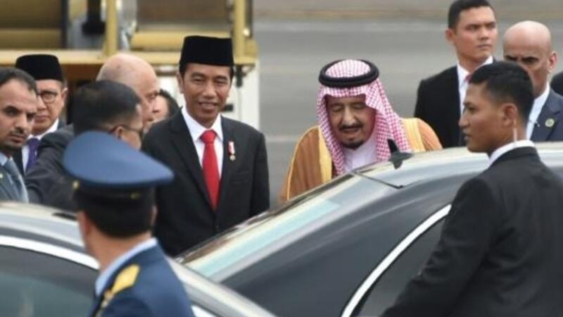 ونزل الملك الذي ترافقه حاشية من الف شخص تقريبا من بينهم امراء ووزراء، من طائرته الرسمية في مطار جاكرتا حيث كان الرئيس جوكو ويدودو في استقباله مع حرس الشرف.