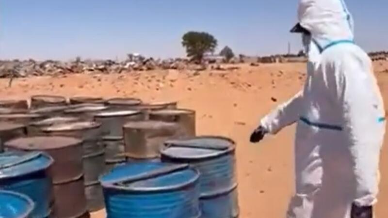 ويظهر في الفيديو شخص بملابس واقية وهو يعد 18 برميلا، قال المحجوب انه تم العثور عليها من قبل الجيش في منطقة تبعد خمسة كيلومترات عن المستودع الذي فقدت منه في اتجاه الحدود التشادية.