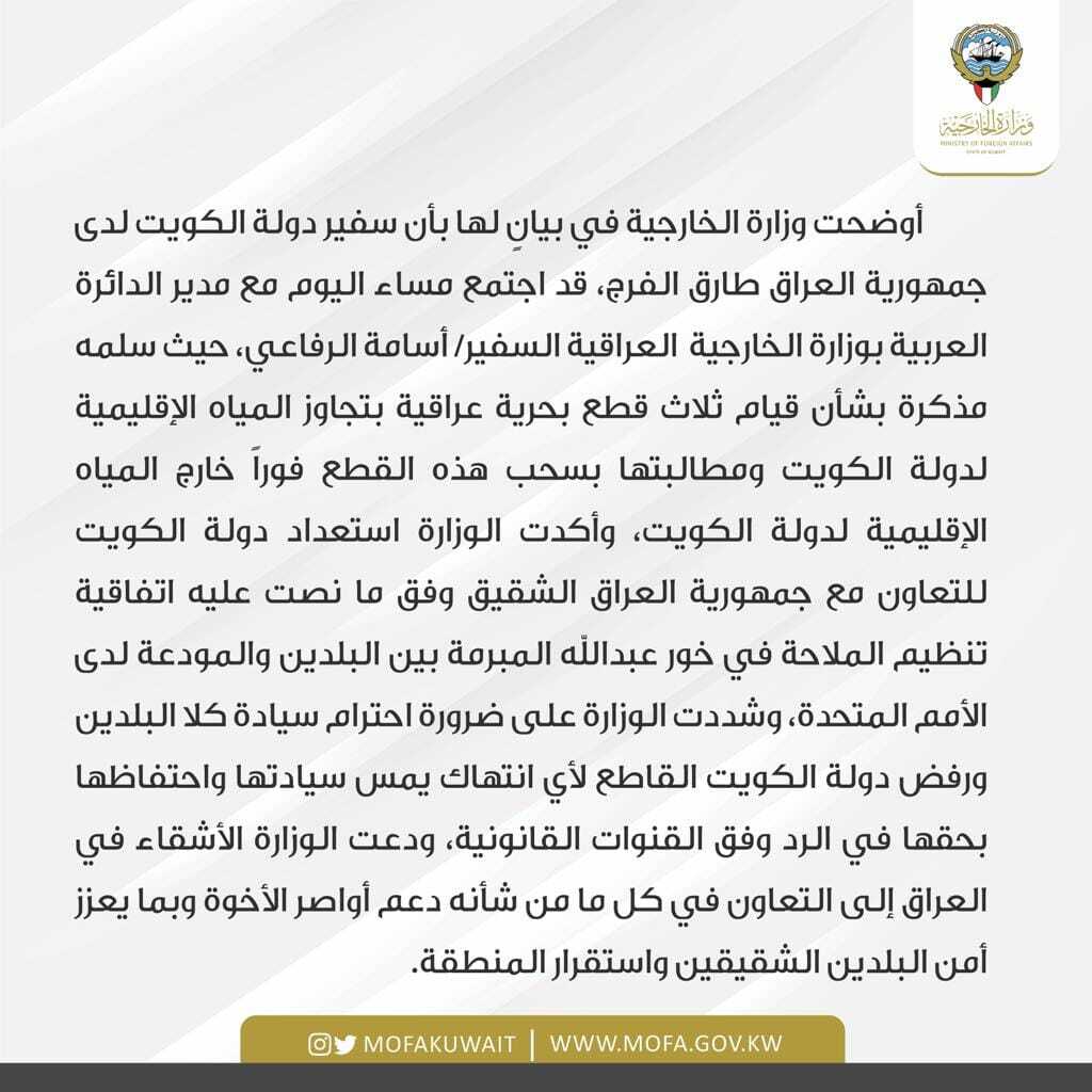 واعلنت وزارة الخارجية الكويتية ان سفيرها لدى العراق طارق الفرج، سلّم المذكرة إلى مدير الدائرة العربية في وزارة الخارجية العراقية السفير أسامة الرفاعي.