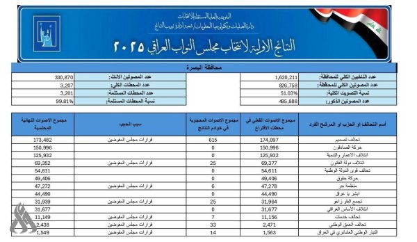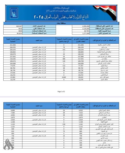 ومن المقرر أن تنشر وكالة الأنباء العراقية (واع) خلال الساعات المقبلة التفاصيل الكاملة للنتائج الأولية لانتخابات مجلس النواب لعام 2025، بما في ذلك عدد المقاعد التي حصلت عليها الكتل والأحزاب السياسية في مختلف المحافظات.