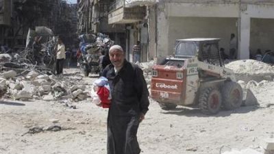 مسن سوري يسير يوم الاثنين وسط أنقاض مبان يقول نشطاء انها دمرت في قصف لقوات موالية للأسد في حلب.