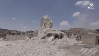 وبث التنظيم تسجيلا مصورا يظهر القاعدة المربعة الباقية من مئذنة المسجد "الحدباء" وسط جبل من الأنقاض بينما ظهرت على مقربة منها سيارات لحقت بها أضرار.