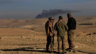 دخان متصاعد وراء أفراد من قوات التدخل السريع العراقية جراء معارك مع تنظيم الدولة الإسلامية إلى الجنوب من الموصل يوم الاثنين