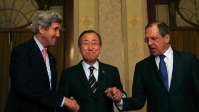 من اليسار: وزير الخارجية الاميركي جون كيري والامين العام للامم المتحدة بان كي مون ووزير الخارجية الروسي سيرغي لافروف بعد لقاءبينهم في مونترو الثلاثاء
