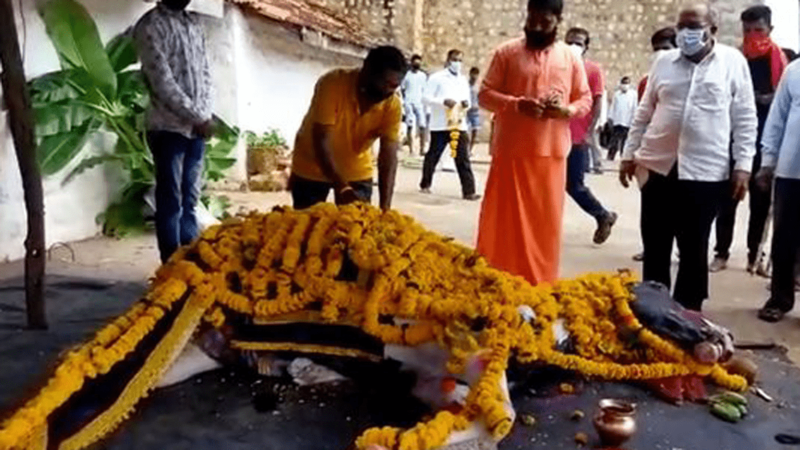 وفي فيديو متداول يمكن رؤية كيف تجمهر المئات لتوديع الحصان الذي اعتبروه ”مقدسا وحام من الفيروس“ في جنازة ضخمة في ولاية كارنتاكا.