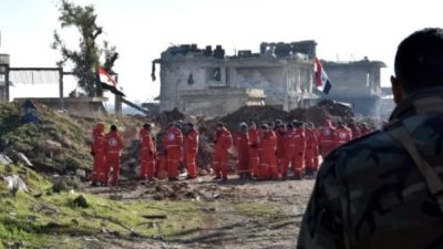 القوات الحكومية وعمال الهلال الاحمر السوري ينتظرون في الراموسة اجلاء المحاصرين من شرق حلب