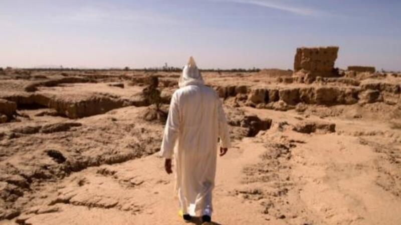 رجل يعبر منطقة ضربها الجفاف كانت جزءا من واحة تفيلالت المغربية الى شمال الريساني والصحراء الكبرى