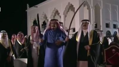 شارك العاهل السعودي، الملك سلمان بن عبد العزيز، نظيره البحريني، حمد بن عيسى، رقصة شعبية، في المنامة.