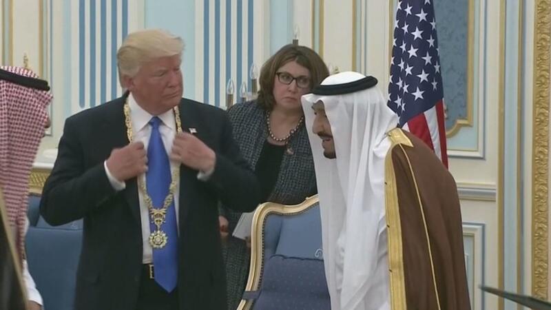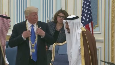 وقلد الملك السعودي الرئيس الأمريكي ترامب، وسام الملك عبد العزيز، وذلك قبيل انطلاق القمة السعودية – الأمريكية في قصر اليمامة في الرياض.