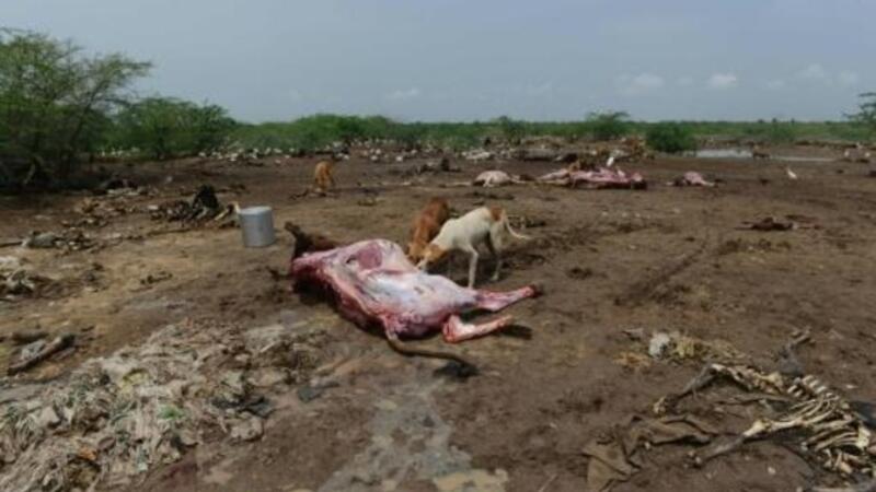 في احد المواقع في منطقة سورندرانغار، تنتشر بقايا الابقار المتحللة، فهنا ايضا ما زال الداليت مضربين عن العمل، رغم الاثر الاقتصادي على حياتهم.