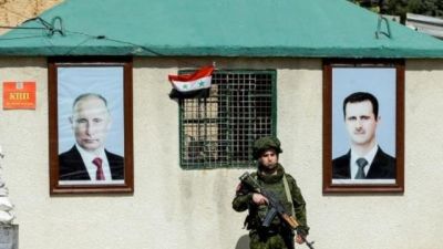 فرد من الشرطة العسكرية الروسية بين صورتي الرئيس فلاديمير بوتين وبشار الأسد عند معبر الوافدين قرب دمشق
