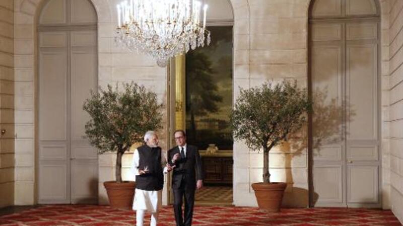 رئيس الوزراء الهندي نارندرا مودي مع الرئيس الفرنسي فرانسوا هولاند في قصر الاليزيه خلال زيارته الى فرنسا