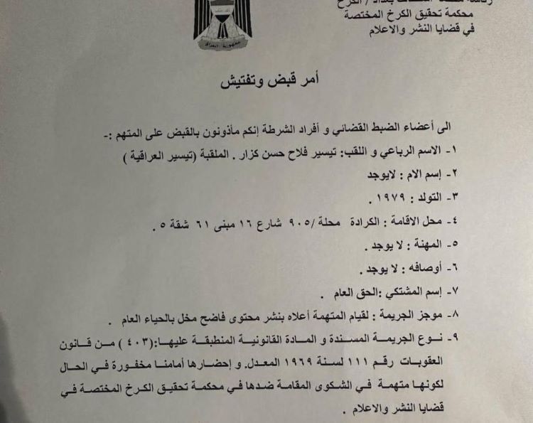 ونقل موقع "شفق نيوز" عن مصدر امني قوله ان امر القبض صدر بحق تيسير العراقية بعد امتناعها عن المثول امام محكمة كانت وجهت امر استقدام لسماع اقوالها في التهمة الموجهة اليها، وهي "نشر محتوى فاضح ومخل بالحياء".