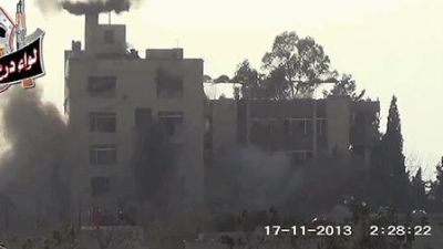وقال المرصد السوري لحقوق الإنسان ان الانفجار اسفر عن انهيار المبنى الواقع بضواحي مدينة حرستا بشكل كامل.