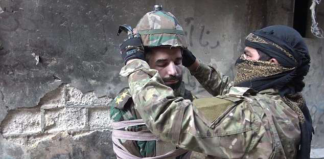 واستخدم الإرهابيون الحبال والألواح الخشبية لتقييد الأسير في منطقة اليرموك التي يسيطر عليها تنظيم داعش في سوريا بالقرب من العاصمة دمشق.