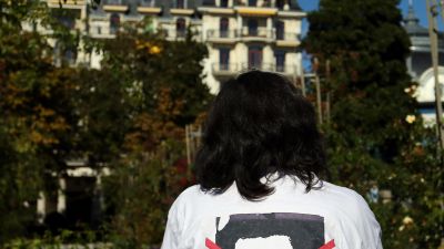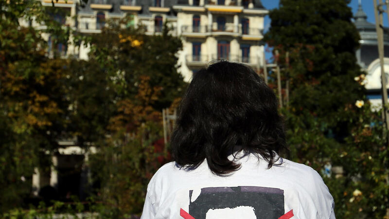 متظاهر يقف امام مقر الاجتماع في لوزان