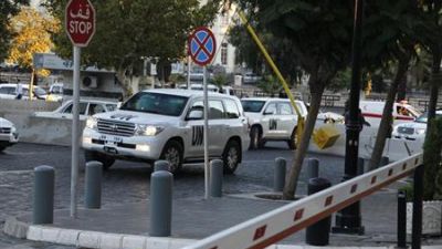 فريق مفتشي الاسلحة الكيماوية التابع للامم المتحدة في طريق عودته لفندق في دمشق