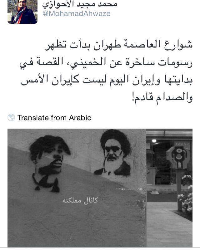 وأكد الصحفى المختص فى الشئون الإيرانية، فى تغريدة له على تويتر " شوارع العاصمة طهران بدأت تظهر رسومات ساخرة عن الخميني، القصة في بدايتها وإيران اليوم ليست كإيران الأمس والصدام قادم!".