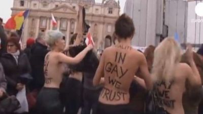 بصدر عار.. ناشطة من Femen تعترض موكب ترامب (صور)