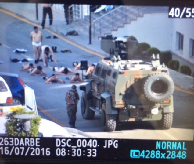 نشرت وسائل إعلام تركية، السبت صورا تظهر عددا من العسكريين الانقلابيين وقد خلعوا لباسهم العسكري، وظهروا في مشهد وهم " شبه عراة".
