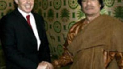 اشاد رئيس الوزراء البريطاني توني بلير بالزعيم الليبي معمر القذافي الذي التقاه في مدينة سرت، كما نوه بالعلاقات التي "تغيرت بالكامل" بين بلاده وليبيا بعد تخلي الاخيرة عن برنامجها النووي، وعبر عن امله في ان تقتدي ايران بهذا البلد العربي.