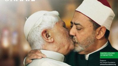 وقد بثت مجموعة بنيتون صورة دعائية مركبة يظهر فيها البابا يقبل شيخ الازهر السني احمد الطيب على فمه باسم مكافحة "الكراهية" مما اثار انتقاد الاوساط الكاثوليكية.