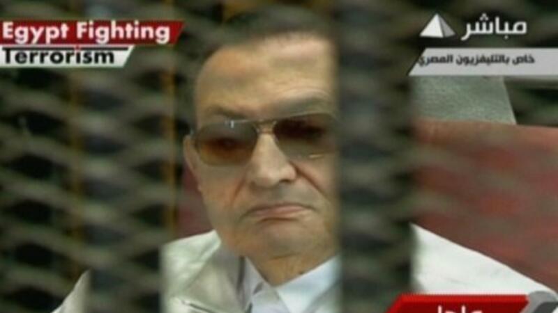 وفي اكاديمية الشرطة، جلس مبارك (85 عاما) وهو يضع نظارات سوداء داخل قفص الاتهام في المحكمة، الى جانب وزير داخليته حبيب العادلي ومتهمين اخرين ونجليه علاء وجمال، بحسب ما ظاهرت لقطات من التلفزيون الرسمي الذي يبث الجلسة بشكل مباشر.