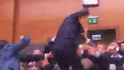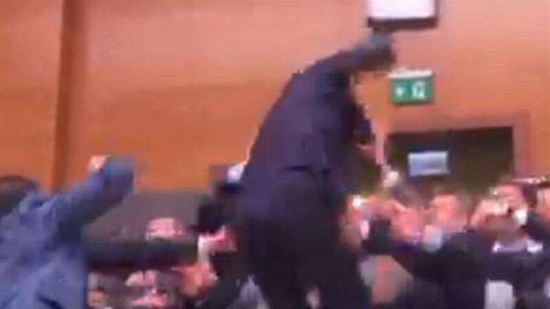 وشوهد عدد من النواب وهم يقفزون فوق الطاولات وينقضون على مجموعة من نواب المعارضة على الجانب الاخر.