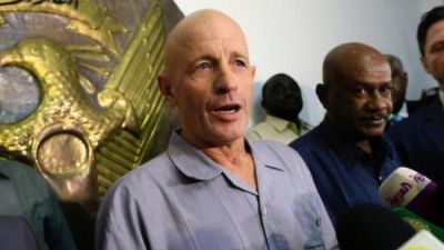 المواطن الفرنسي الذي تم إطلاق سراحه من أيدي مختطفيه في غارة نظمتها فرنسا وتشاد والسودان يتحدث لصحفيين في مطار الخرطوم