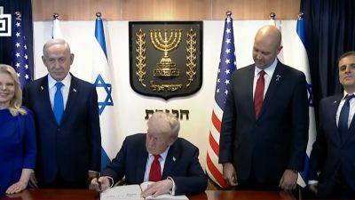 ووصل الرئيس الأميركي إلى تل أبيب، في زيارة قصيرة حيث يلقي خطابا أمام الكنيسيت، قبيل إعلان "انتهاء الحرب".