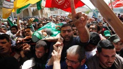 وردد المشيعون هتافات تطالب “بالثأر” لبرادعية، حاملين الأعلام الفلسطينية وصور الشهيد.