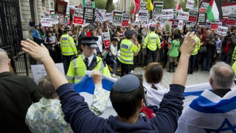 تواجه متظاهرون مؤيدون للفلسطينيين وآخرون للاسرائيليين الاربعاء امام مقر رئيس الحكومة البريطانية في داونينغ ستريت حيث يرتقب وصول رئيس الوزراء الاسرائيلي بنيامين نتانياهو بعد الظهر الى لندن.