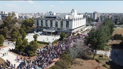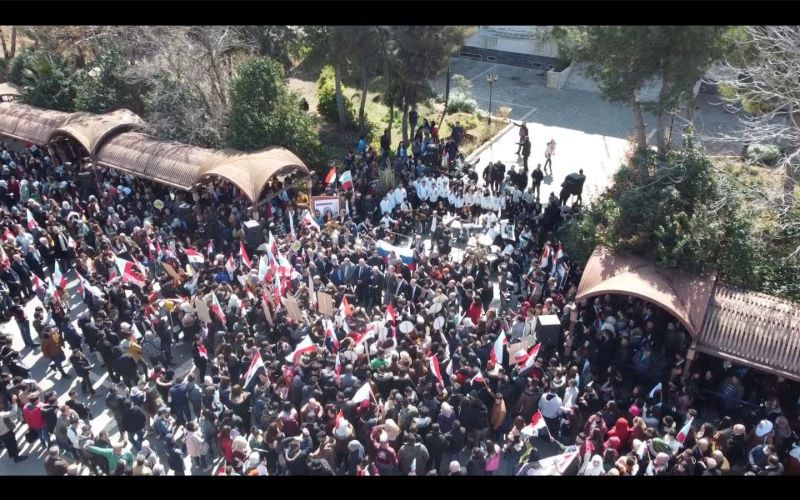 وقال مدير جامعة البعث عبد الباسط الخطيب إن نحو 20 ألف طالب وطالبة اضافة الى أساتذة الجامعة وممثلي الهيئات العامة من الجامعة شاركوا في التظاهرة التي رفعت خلالها الاعلام الروسية والسورية.
