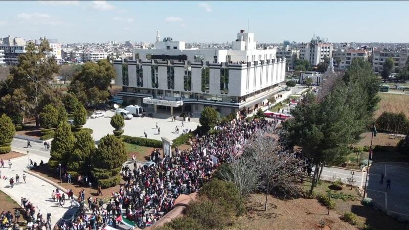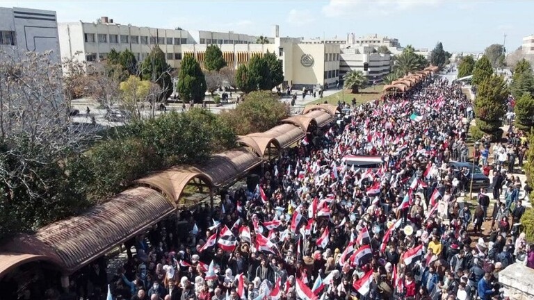 شهدت محافظة حمص السورية الاربعاء، تظاهرة حاشدة شارك فيها الاف الطلاب دعما للهجوم العسكري الذي تشنه روسيا في أوكرانيا.