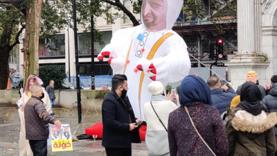 ورفع المشاركون في التظاهرة التي نظمت في ميدان "ماربل آرش" الشهير، وسط لندن، بالونا كبيرا حمل صورة ولي العهد الإماراتي محمد بن زايد في إشارة إلى دور الإمارات بالضغط على السودان، لتطبيع العلاقات مع الاحتلال.